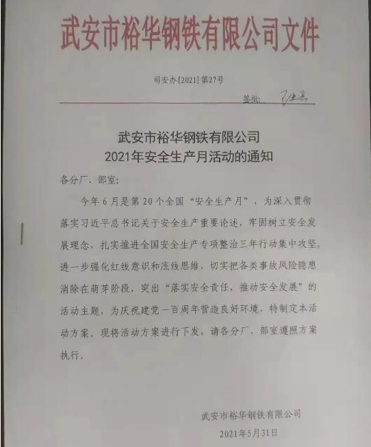 今年6月是第20個全國“安全生產(chǎn)月”,為深入貫徹落實習(xí)近平總書記關(guān)于安全生產(chǎn)重要論述,牢固樹立安全發(fā)展理念,扎實推進安全生產(chǎn)專項整治三年行動集中攻堅,進一步強化紅線意識和底線思維,切實把各類事故風(fēng)險隱患消除在萌芽階段,突出“落實安全責(zé)任,推動安全發(fā)展”的活動主題,全力維護安全生產(chǎn)形勢持續(xù)穩(wěn)定,為慶祝建黨百年營造良好環(huán)境,6月1日,裕華鋼鐵“2021年安全月啟動大會”在公司能源三樓會議室召開。